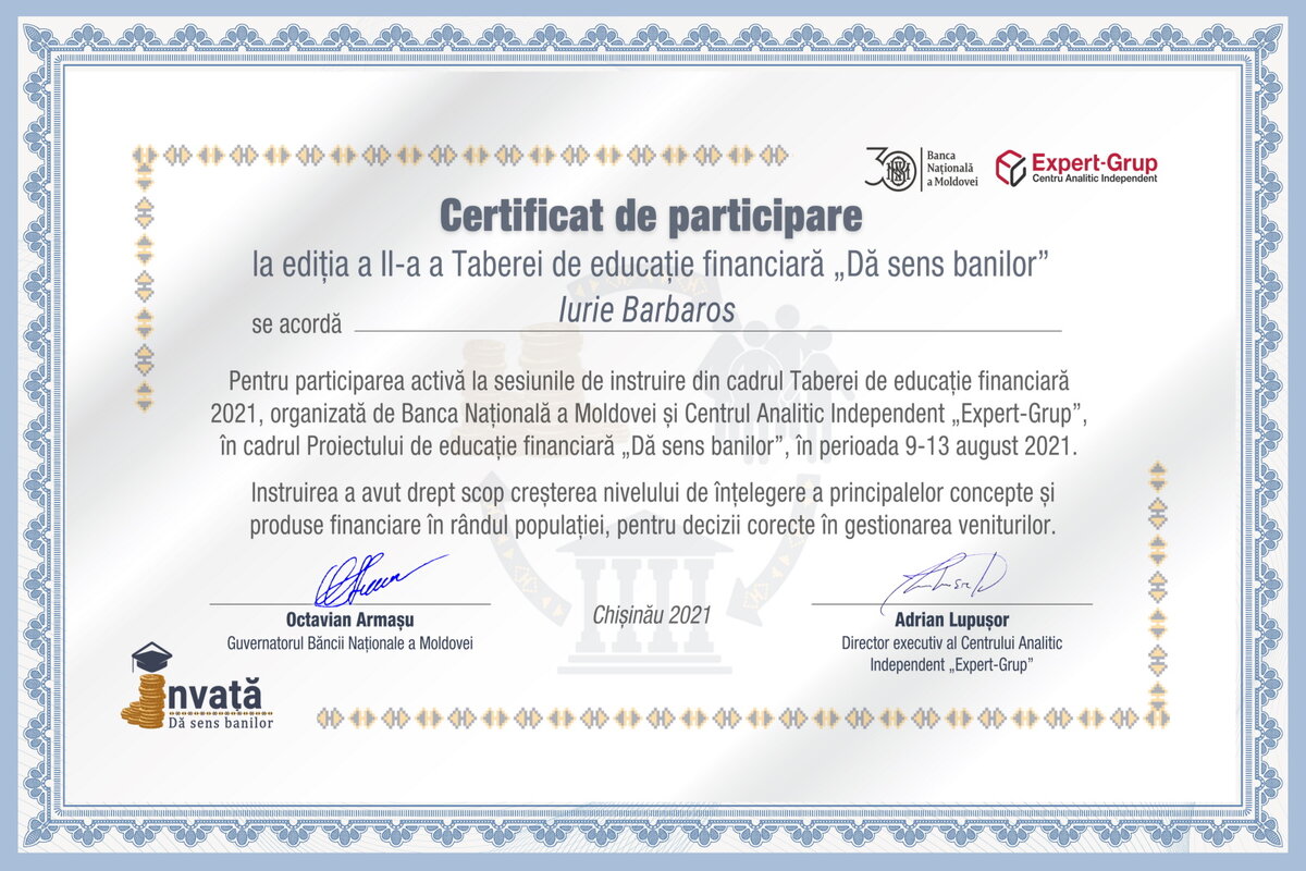 Certificat de Educație Financiară ”Dă sens banilor!”, 2021